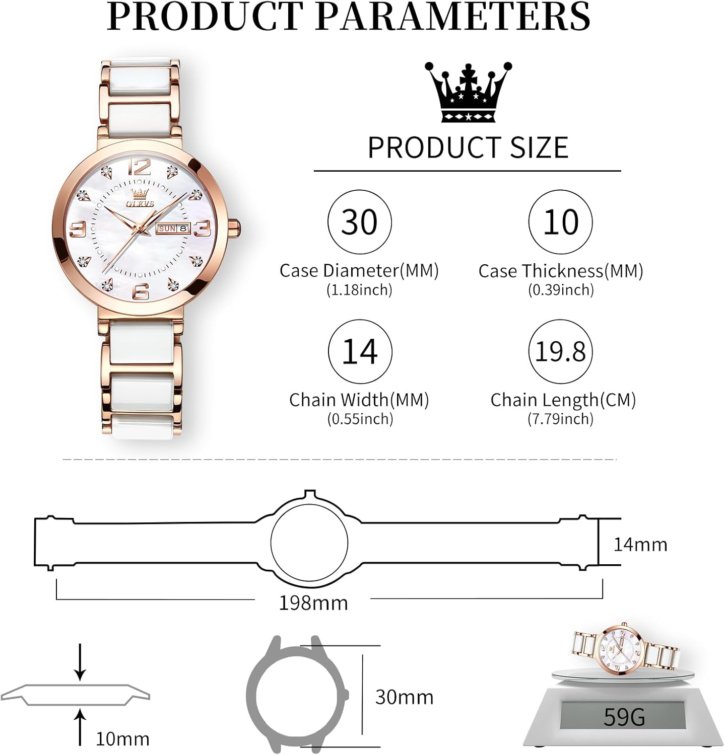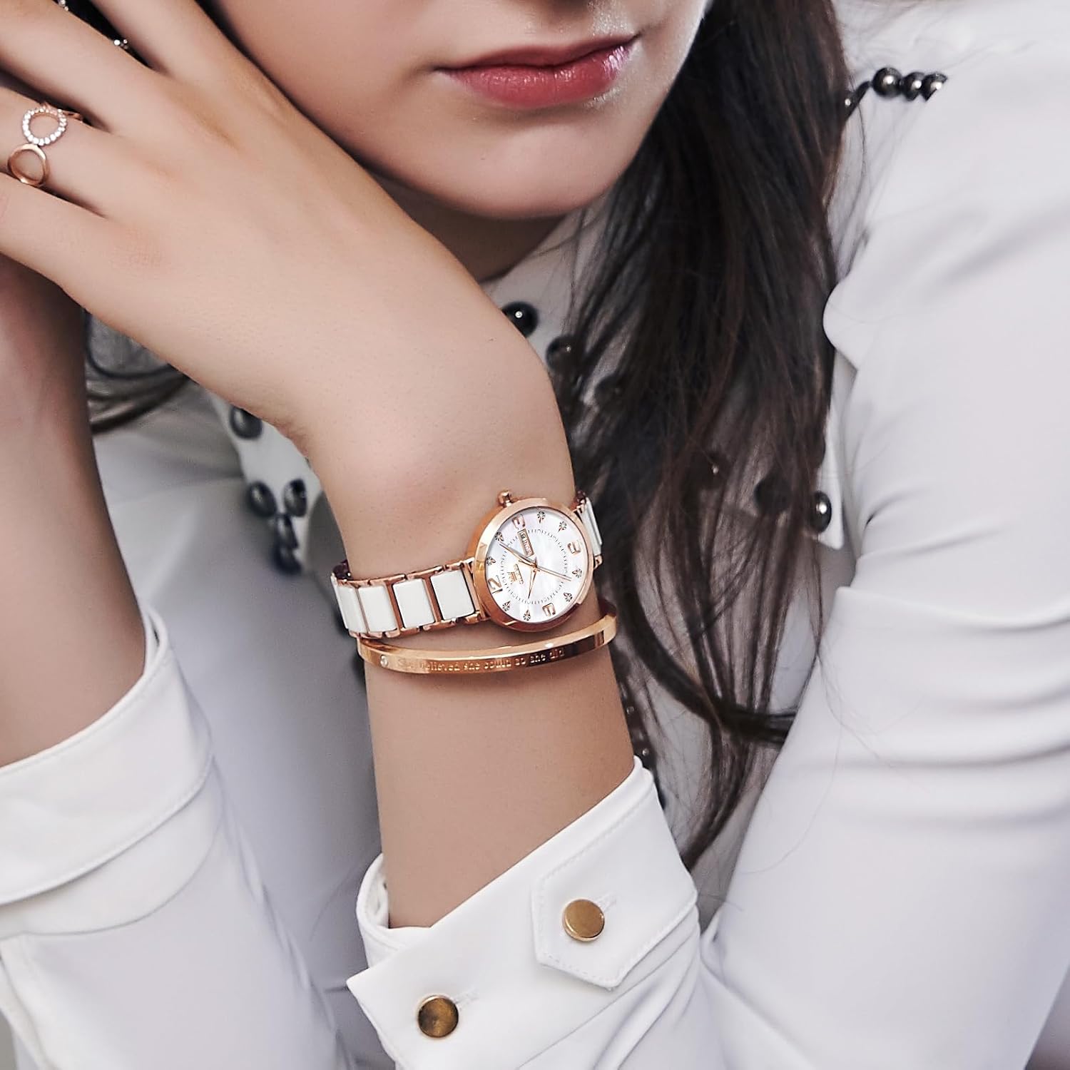 This OLEVS watch is ideal for women seeking a balance of style and function. Its elegant design makes it suitable for professional environments, such as business meetings or office settings, where a polished appearance matters. The rose gold and diamond detailing also make it a standout choice for social events, dinners, or date nights. Thanks to its waterproof rating, it holds up well during daily activities like washing hands, walking in the rain, or light household tasks. The lightweight ceramic band ensures comfort during extended wear, whether you’re at work or out for the evening. The inclusion of day and date functions adds practical value for busy individuals who want quick access to calendar information without checking their phone.