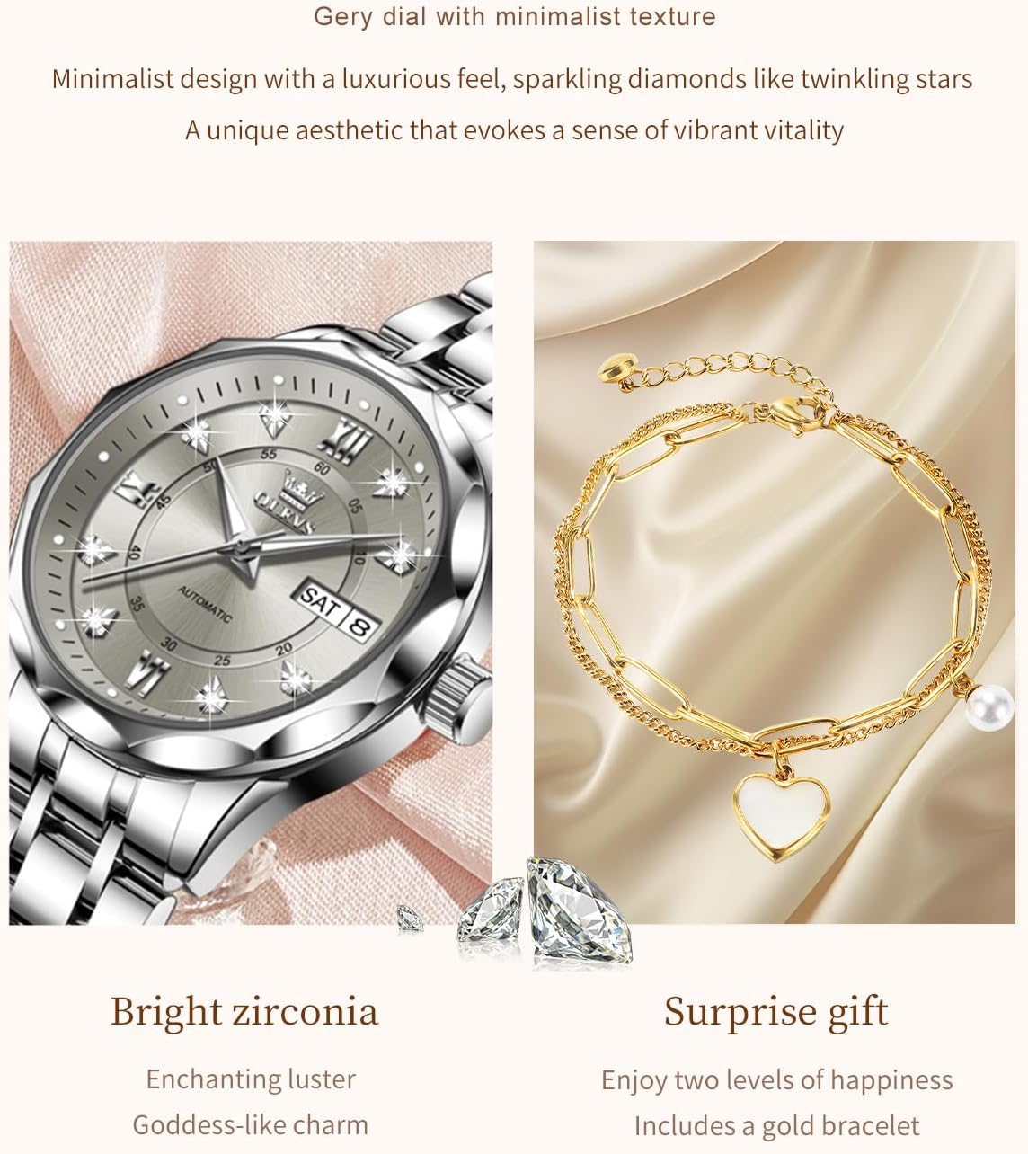 The OLEVS Women’s Casual Modern Diamond Automatic Mechanical Watch is a thoughtfully designed timepiece that blends everyday practicality with refined elegance. Crafted for the modern woman, this self-winding dress watch features a clean, contemporary aesthetic enhanced by subtle luxury details. Its automatic mechanical movement ensures reliable timekeeping without the need for batteries, drawing energy from the natural motion of your wrist. The two-tone stainless steel construction offers a balanced contrast that transitions effortlessly from professional settings to evening events. Diamond accents are carefully set into the bezel, providing just the right amount of sparkle to elevate its appearance without overpowering its minimalist design. With functional subdials displaying both the date and day of the week, this watch supports daily organization while maintaining a sleek, feminine profile. Whether worn during a busy workweek or a special weekend occasion, it delivers consistent style and dependable performance.