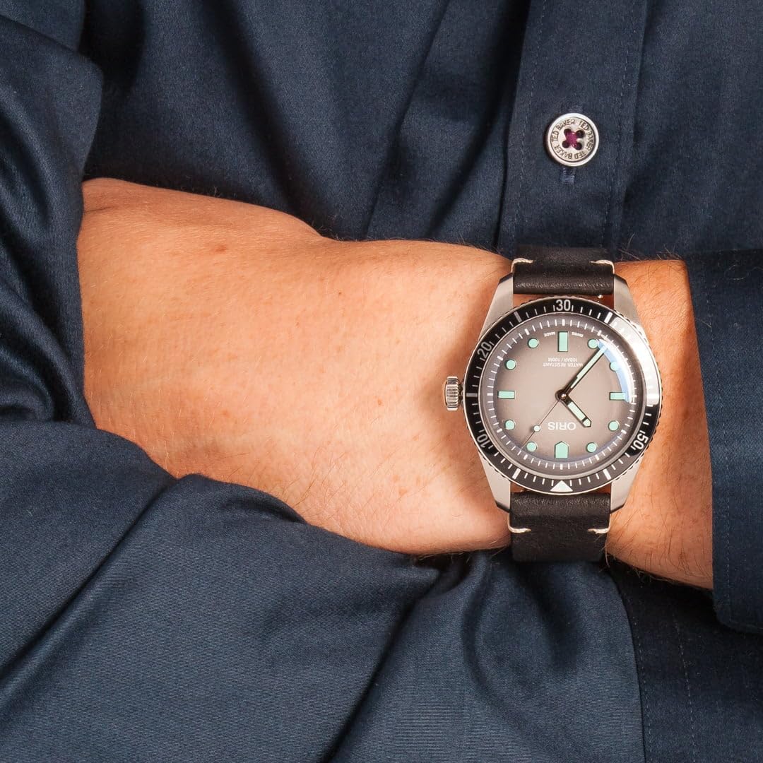 • Vintage-Inspired Design – The watch draws direct inspiration from Oris dive watches of the 1960s, featuring a softly rounded case profile, domed sapphire crystal, and a retro dial layout that honors its heritage while maintaining modern legibility. The overall silhouette is understated yet distinctive, evoking the spirit of early recreational diving watches without sacrificing contemporary refinement.