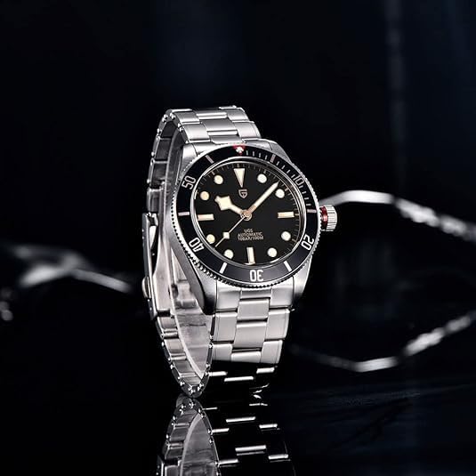 I have a number of Pagani Design watches and added this to the collection (Rolls Timi is the manufacturer). This is a Chinese watch, but made well–Pagani is generally regarded as one of the better entry-level of quality Chinese watches. It’s a heavy beast at 187 grams and is a beefy 42mm across so it may wear large on smaller wrists. It’s also thick to accommodate the automatic self-winding mechanism–not sure why the case has to be this tall; other mechanical watches using this movement are thinner, but there you go. It’s attractive and is styled after the Tudor BB58 watch. Be aware that the bezel (the “”red” part) is printed aluminum, not engraved ceramic as with most Paganis. This is not an issue, just something to know–many high end watches, including Rolex, have used printed aluminum for years. My only issue was with the color of the bezel–it’s not a straight-up red like the Tudor and some of the other similar design watches, but has a bit of purple in it. But if you’re cool with that, it’s a great watch.