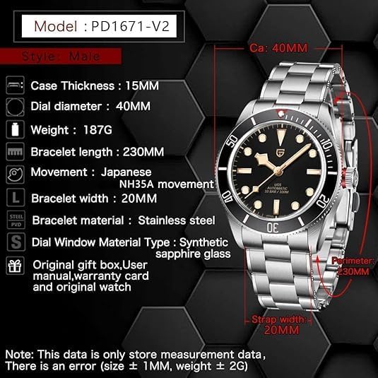 Brand Name Pagani Design Model PD-1671 Case Thickness 14MM Dial Diameter 42MM Weight 179g Max Perimeter 260MM Movement Japan NH35 Band Width 21MM Band Material Stainless steel Dial Window Material Type Synthetic sapphire glas