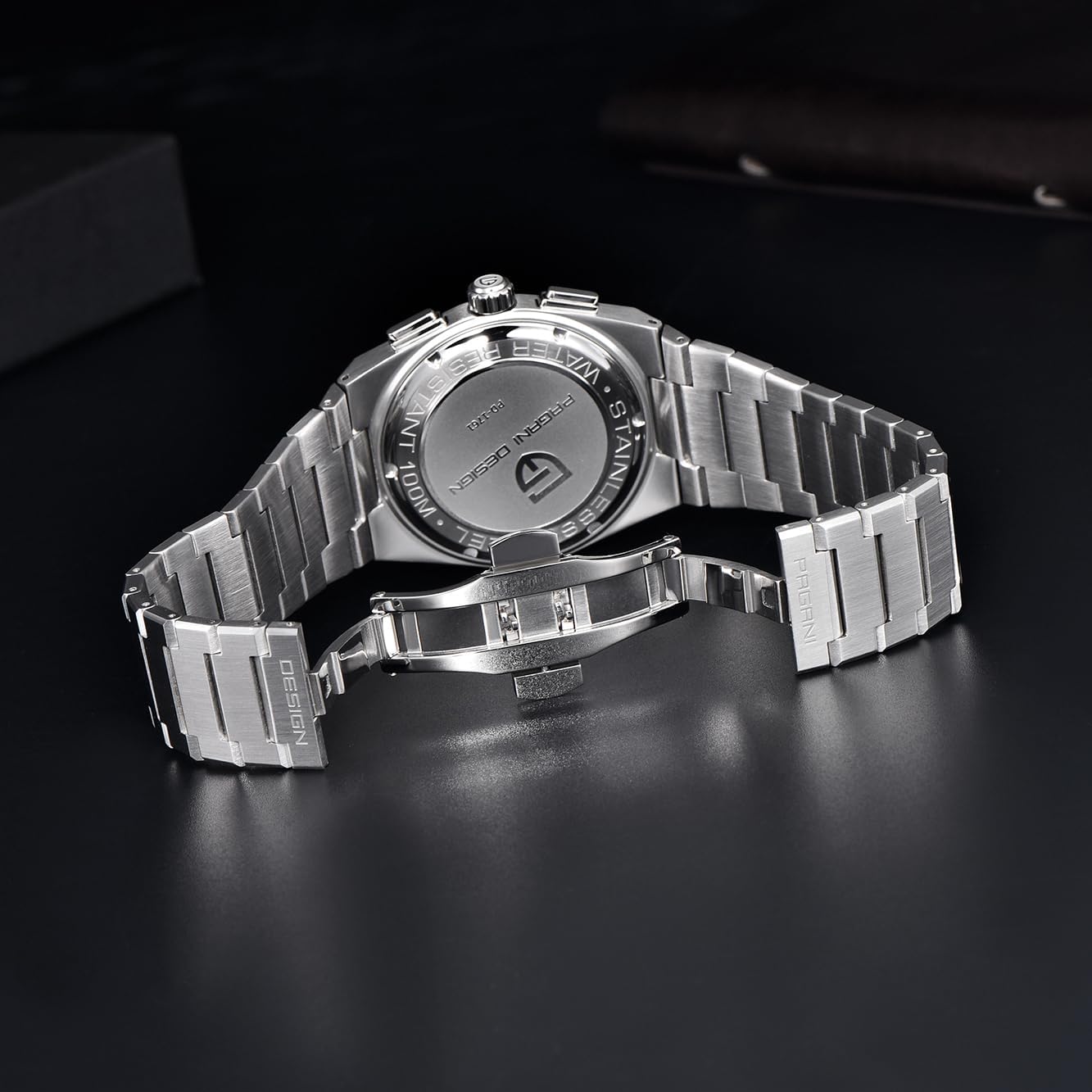 The Pagani Design PD-1761 is a precision-engineered men’s chronograph watch that blends sporty functionality with refined dress watch aesthetics. Designed for discerning men who appreciate technical accuracy and timeless style, this timepiece features a Japanese TMI VK63 quartz movement known for its reliability and smooth 60-second flyback chronograph operation. The 40mm case strikes an ideal balance between presence and wearability, making it suitable for both professional settings and casual occasions. Crafted with premium materials including 316L stainless steel and synthetic sapphire crystal, this watch delivers exceptional durability and clarity. Its luminous markers and hands ensure visibility in low-light conditions, while the 100m water resistance adds practical versatility for everyday wear.