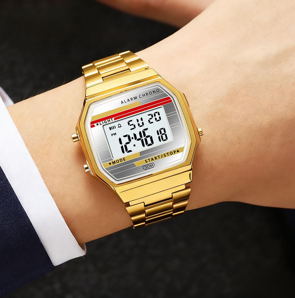 The Retro Digital Watch with Stainless Steel Band blends timeless vintage styling with modern electronic functionality, creating a unisex timepiece that transitions seamlessly from daily routines to active pursuits. Designed for both men and women, this wristwatch delivers dependable performance whether you’re hitting the gym, navigating a busy workday, or enjoying casual weekend outings. Its electronic movement ensures accurate timekeeping, while a suite of practical features—including dual time zones, a stopwatch, and an EL backlight—enhances usability across various situations. The 30-meter water resistance rating means you won’t need to remove it during handwashing, light rain, or brief immersion, and the stainless steel band provides a secure, comfortable fit that resists corrosion and daily wear. With its balanced combination of form and function, this watch is built to support an active, on-the-go lifestyle without sacrificing style.