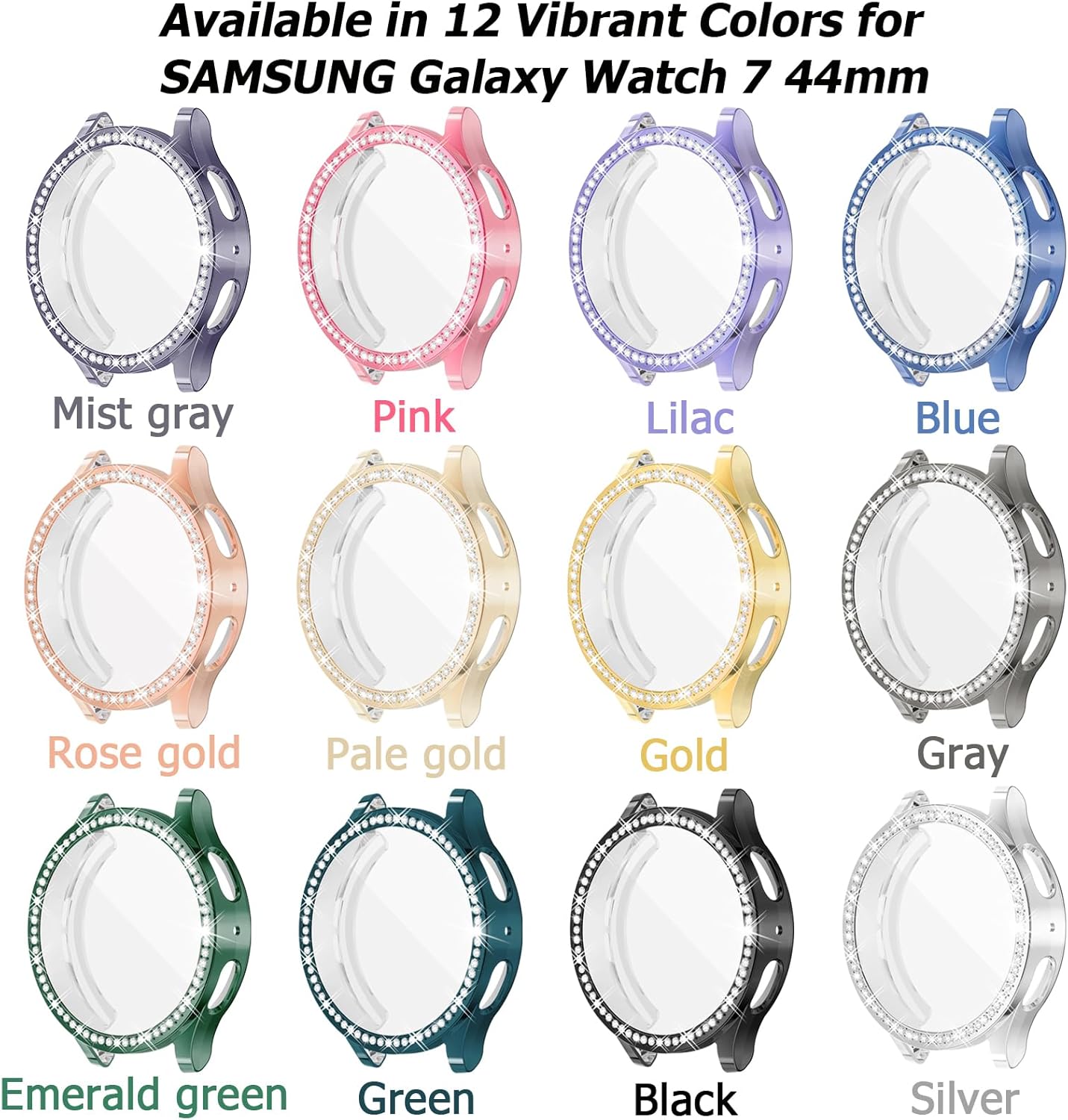 【12 PACK MULTI-COLORS & RHINESTONE】The watchcase come with 12 vibrant colors. Gold / Pale gold / Rose gold / Lilac /Pink / Blue / Green / Emerald green / Mist gray / Silver / Gray / Black. Richone Samsung watch 7 covers set with a ring of sparkle rhinestones, protecting your watch and adding a little aesthetic interest to your daily outfits. Easy to match with various watchbands, match with your dress and phone case, your any outfit or nails easily.