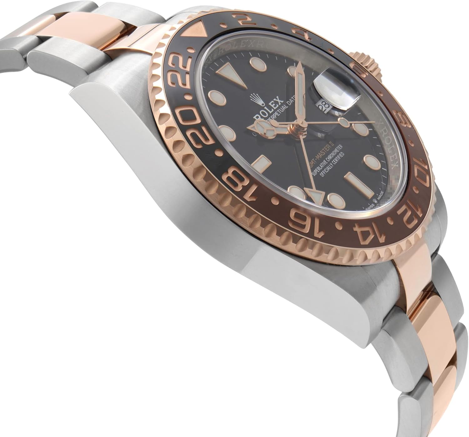40mm Everose Rolesor case with Oystersteel monobloc middle case, screw-down Everose gold crown, Everose gold bidirectional rotatable 24-hour graduated bezel with brown and black Cerachrom insert and engraved numerals, scratch-resistant sapphire crystal with cyclops lens over the date, black dial, hour markers set with Chromalight, Rolex calibre 3285 self-winding movement with second time-zone hour hand and instantaneous date, approximately 70 hours of power reserve, Everose Rolesor Oyster bracelet with flat three-piece links, folding Oysterclasp buckle with Easylink 5mm comfort extension link. Waterproof to 100 meters.