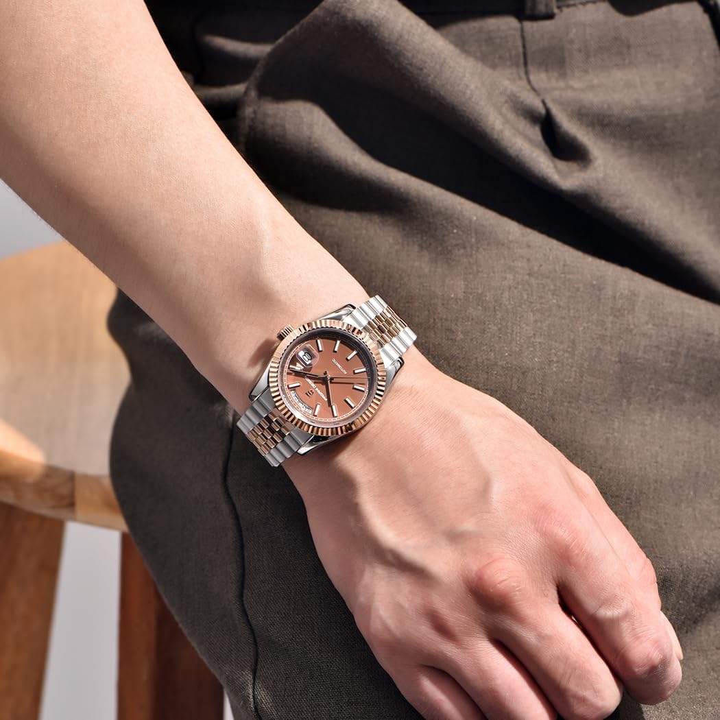 • Two-Tone Rose Gold Case: The combination of stainless steel and rose gold plating creates a rich, contemporary look that pairs well with both formal attire and casual outfits, offering versatility across occasions.