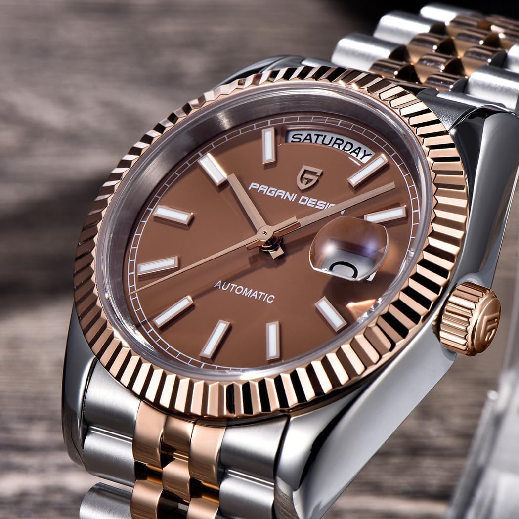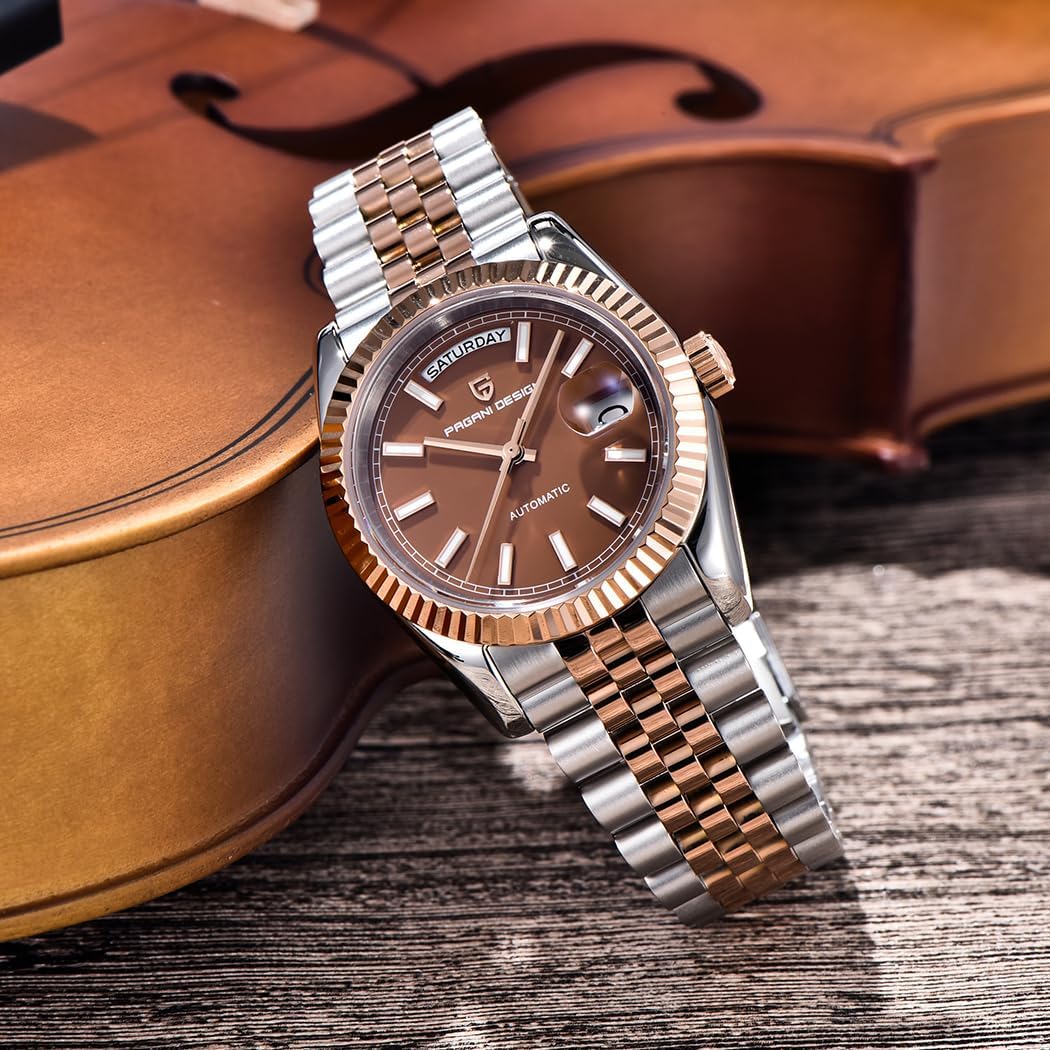 The RollsTimi Pagani Design Men’s Watch DD36 is a meticulously crafted luxury timepiece tailored for men who value precision, durability, and refined aesthetics. At its core lies the ST16 mechanical movement, known for delivering consistent and reliable performance with minimal upkeep—ideal for those who appreciate the craftsmanship of mechanical watches without the hassle of frequent servicing. The watch features a 40mm two-tone rose gold case, blending polished stainless steel with a warm rose gold finish that adds depth and sophistication to its overall appearance. This elegant design is protected by a sapphire crystal glass front, offering exceptional resistance to scratches from everyday contact with surfaces like desks, keys, or countertops, ensuring the dial remains clear and unmarked over time.