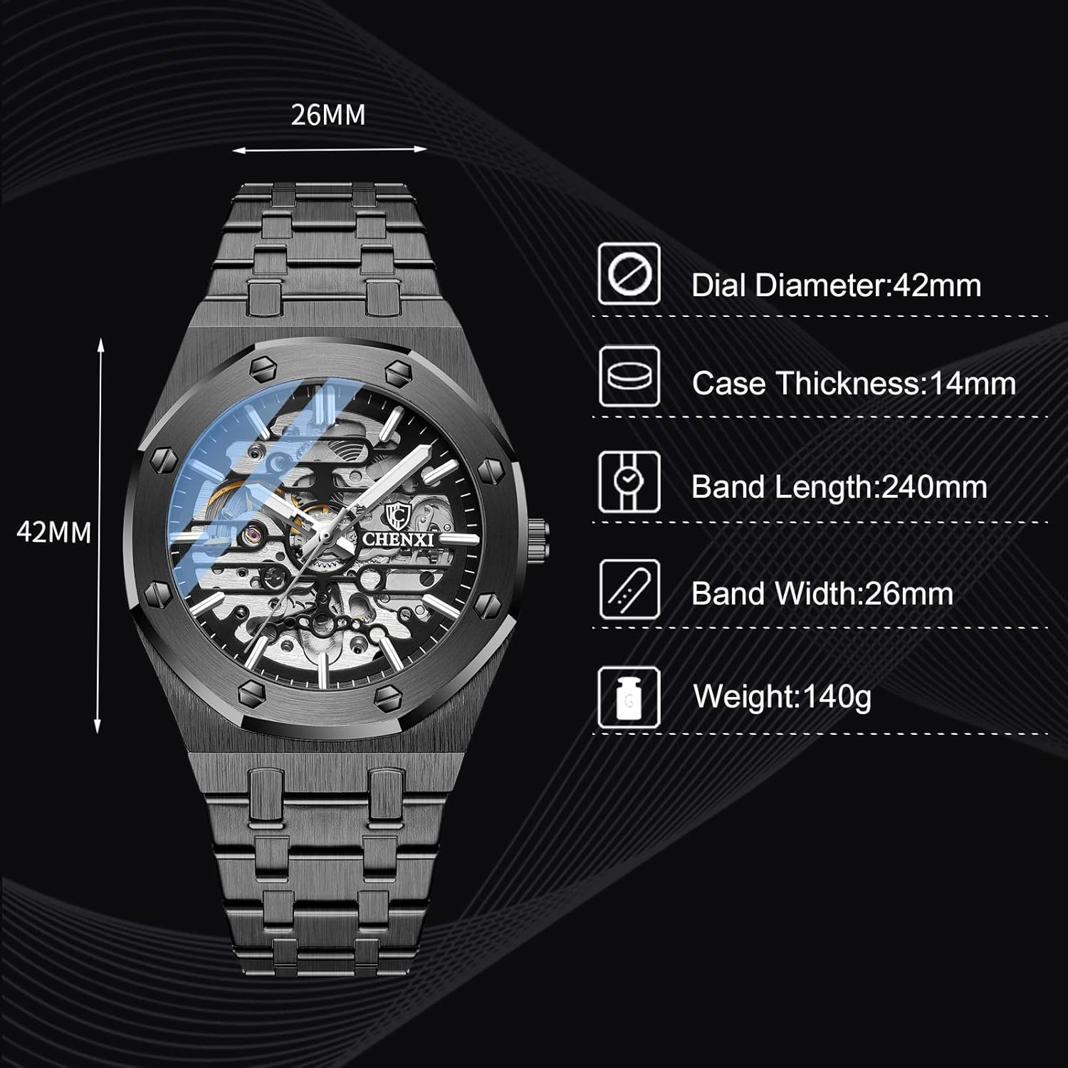 Clean smooth Mineral glass, wear-resistance.The mechanical men’s wristwatch with Skeleton design bottom offers a clear view of the mechanical movement.