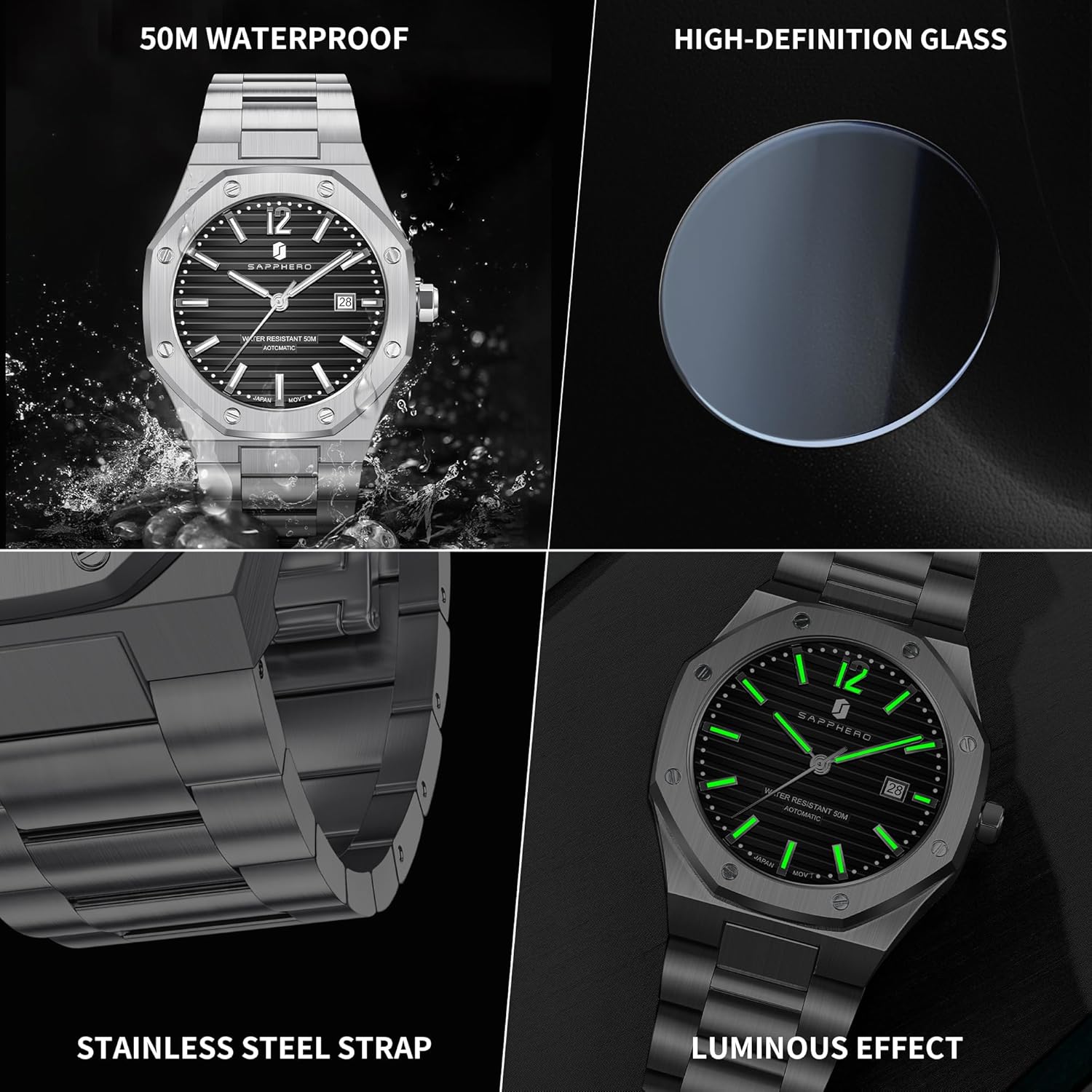 The SAPPHERO Men’s Mechanical Automatic Watch is a modern, stylish timepiece designed for men who appreciate precision, durability, and refined aesthetics. Built for both business and casual settings, this watch seamlessly transitions from the boardroom to evening events, offering a polished look without sacrificing functionality. Its 50M water resistance and automatic mechanical movement ensure reliable performance in everyday conditions. Crafted with attention to detail, it reflects SAPPHERO’s commitment to blending quality craftsmanship with contemporary design. Ideal for professionals and watch enthusiasts alike, this stainless steel strap watch makes a confident statement with understated elegance.