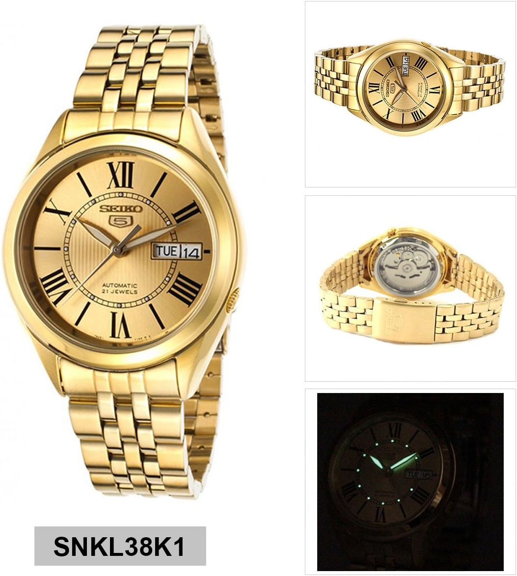 - High-Contrast Dial Design: The gold tone dial features black Roman numeral hour markers and luminous hands, ensuring excellent readability in both daylight and low-light conditions.