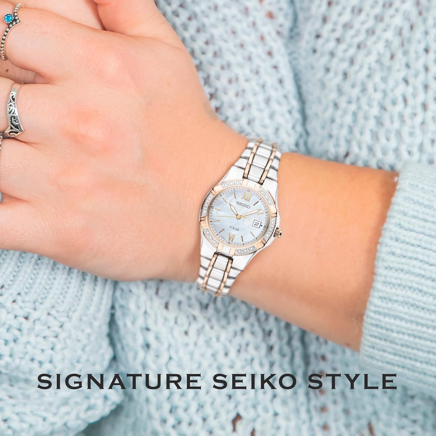 The SEIKO SUT068 is ideal for women who seek a timepiece that balances beauty with functionality. Its solar-powered mechanism ensures consistent performance without the need for battery replacements, making it a practical choice for busy lifestyles. The inclusion of a day/date calendar adds everyday utility, helping wearers stay organized with ease. The diamond accents and mother-of-pearl dial make it suitable for evening events, formal gatherings, or as a statement piece in professional settings. The two-tone rose gold and stainless steel design pairs effortlessly with both casual and dressy attire, offering versatility across seasons and occasions. With 50-meter water resistance, it can handle typical daily exposures such as rain or washing hands, though it should be removed before swimming or bathing. The lightweight construction and ergonomic bracelet ensure comfort throughout the day, while the durable Hardlex crystal protects against minor scratches.