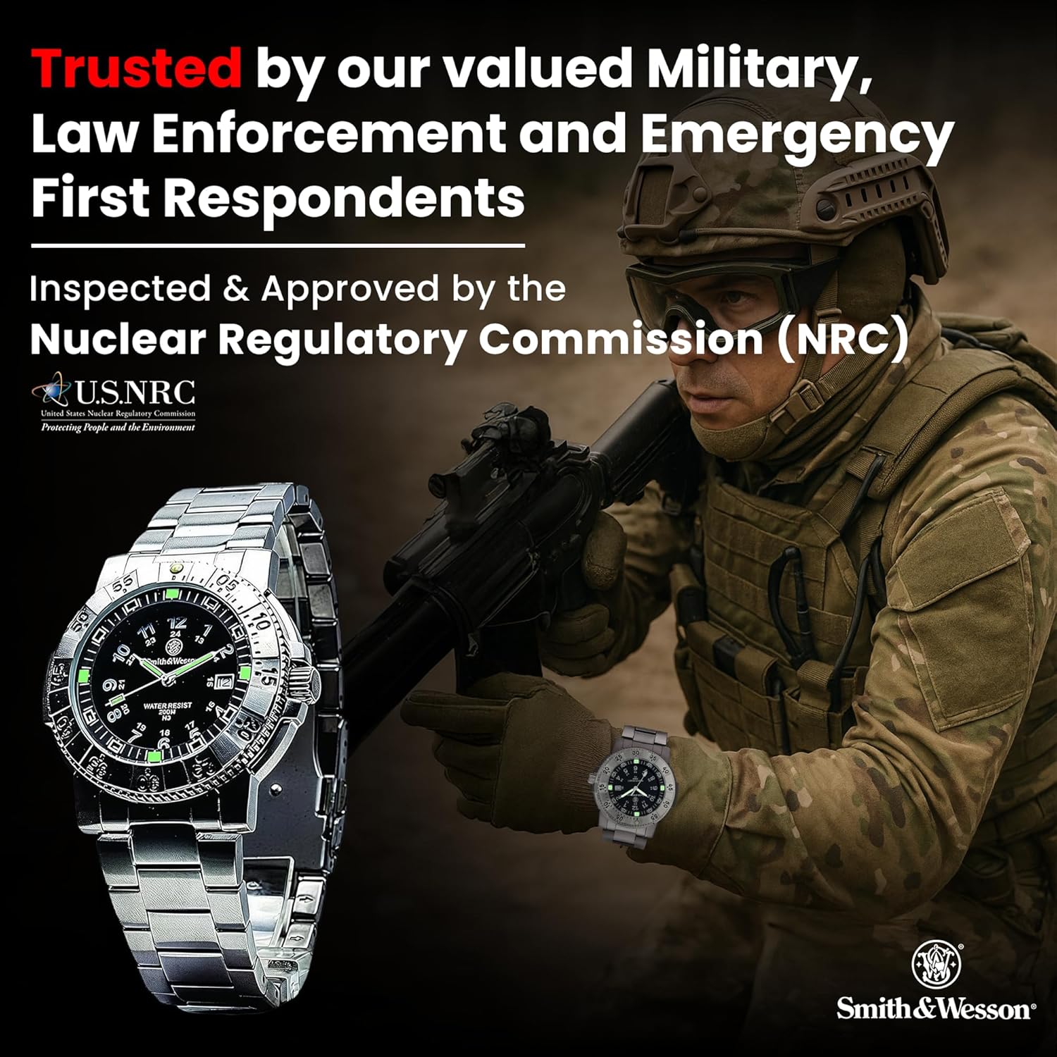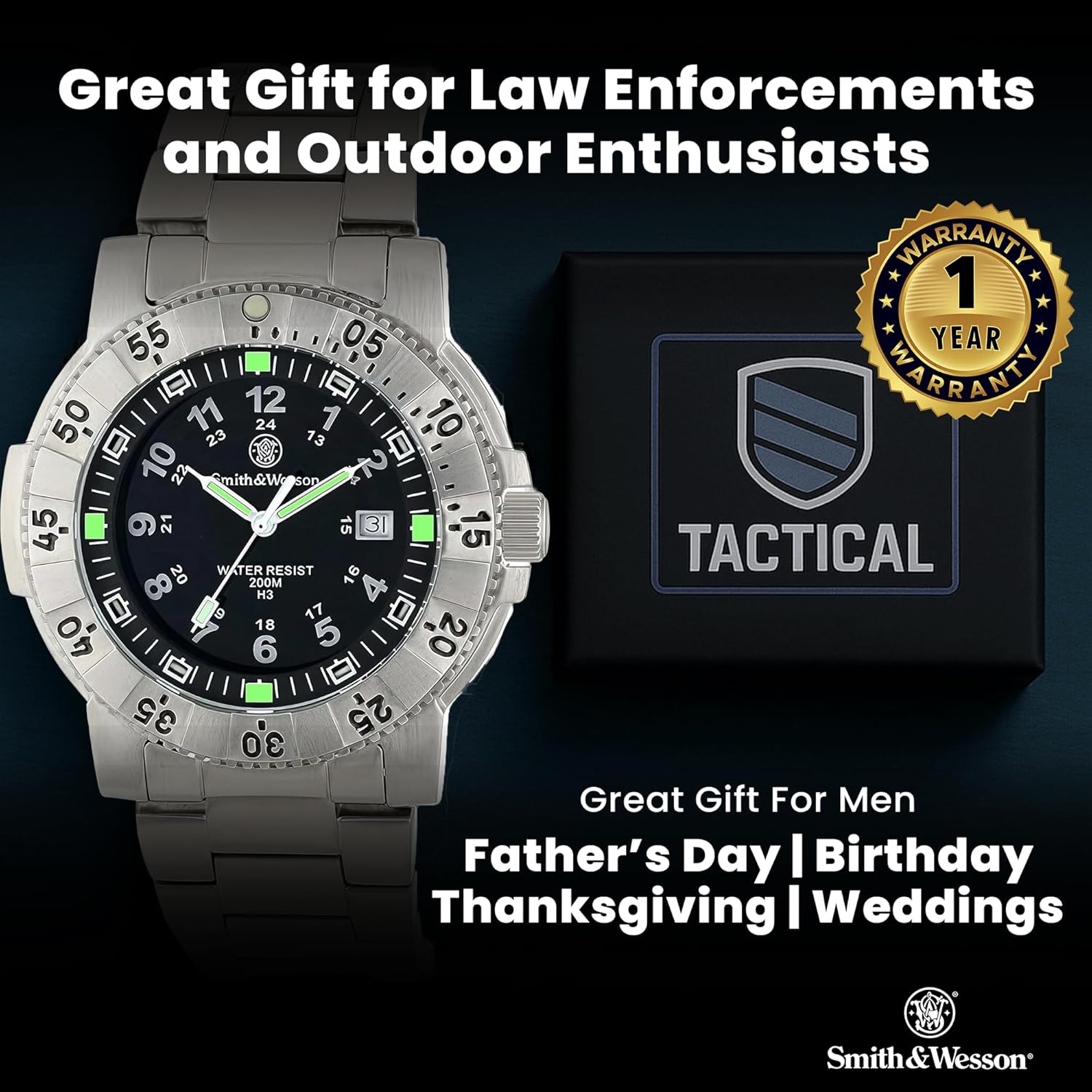 The Smith & Wesson 357 Series Swiss Tritium H3 Tactical Military Watch is built for men who demand reliability, visibility, and durability in extreme conditions. Designed with input from professionals in law enforcement and the armed forces, this tactical diver watch delivers unmatched readability in total darkness thanks to its self-powered tritium illumination system. Whether you’re navigating a nighttime operation, exploring underwater environments, or simply need a dependable everyday timepiece, this watch performs when it matters most. Its rugged titanium construction and military-grade engineering make it ideal for adventurers, first responders, and outdoor enthusiasts who refuse to compromise on performance.