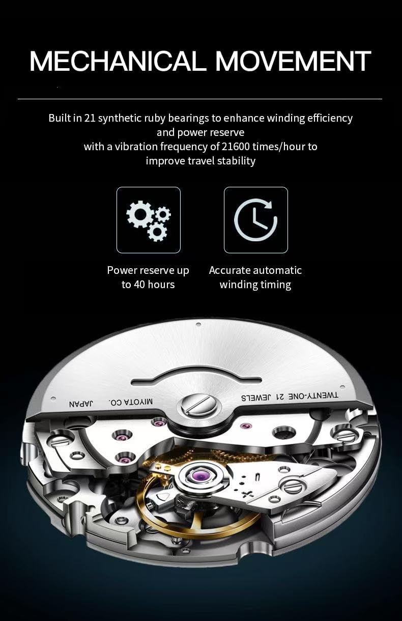 - Automatic Miyota 8215 Movement: Sourced from Japan, the Miyota 8215 is a well-regarded automatic movement known for its durability and precision. It operates without a battery, instead relying on a rotor that spins with wrist movement to wind the mainspring. This results in smooth, continuous timekeeping and a satisfying mechanical feel that digital or quartz watches can’t replicate.