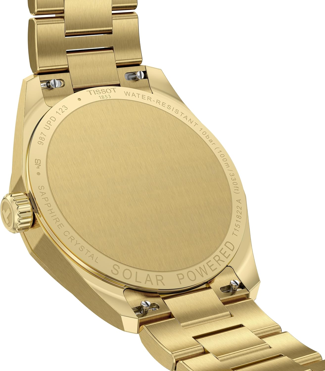 The Tissot PRC 100 Solar reimagines a beloved classic from the mid-2000s, blending its original bold character with today’s most advanced sustainable watchmaking. Designed exclusively for women, this 34mm timepiece combines refined aesthetics with intelligent functionality. At its heart lies Tissot’s Lightmaster Solar Quartz movement—a precision engine that draws energy from any light source, natural or artificial, to power the watch indefinitely. No more battery changes, no interruptions—just consistent, eco-friendly performance. The stainless steel case is finished in lustrous gold PVD, offering a warm, luxurious tone that resists fading and wear. Paired with a matching gold PVD stainless steel bracelet, the watch presents a cohesive, polished look that transitions seamlessly from daytime professionalism to evening elegance.