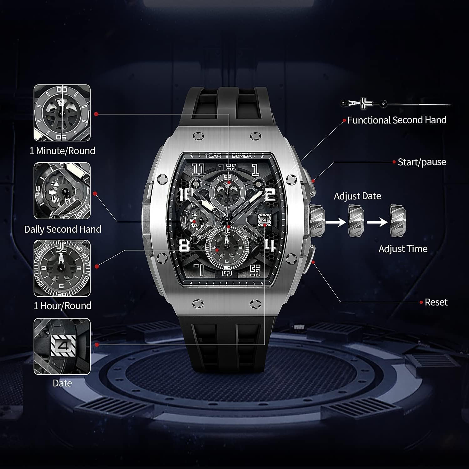 This automatic watch is ideal for men seeking a reliable, low-maintenance timepiece with a distinctive design. Its self-winding mechanism makes it perfect for daily wear, as regular movement keeps it powered without intervention. The 50M water resistance allows confidence during everyday activities like washing hands, walking in the rain, or swimming in a pool. The interchangeable strap system supports style flexibility—switch from black to colored straps to match business attire, casual wear, or sporty outfits. The sapphire crystal and stainless steel construction ensure the watch withstands daily wear and tear, while the luminous hands enhance usability in dim environments. Whether as a personal upgrade or a gift, the TSAR BOMBA 8210 offers a blend of durability, functionality, and modern aesthetics.
