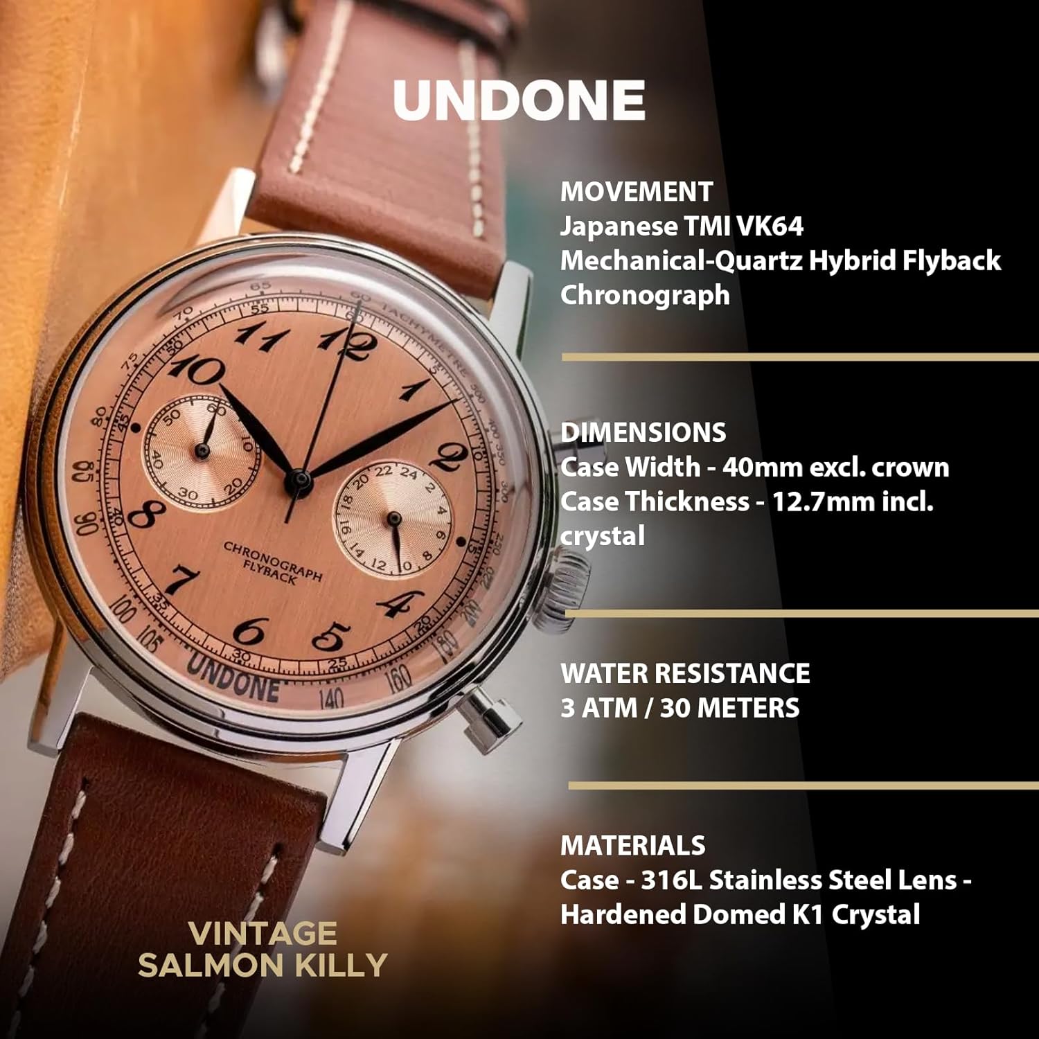 - Movement Type: TMI VK64 Mechanical-Quartz Hybrid Flyback Chronograph