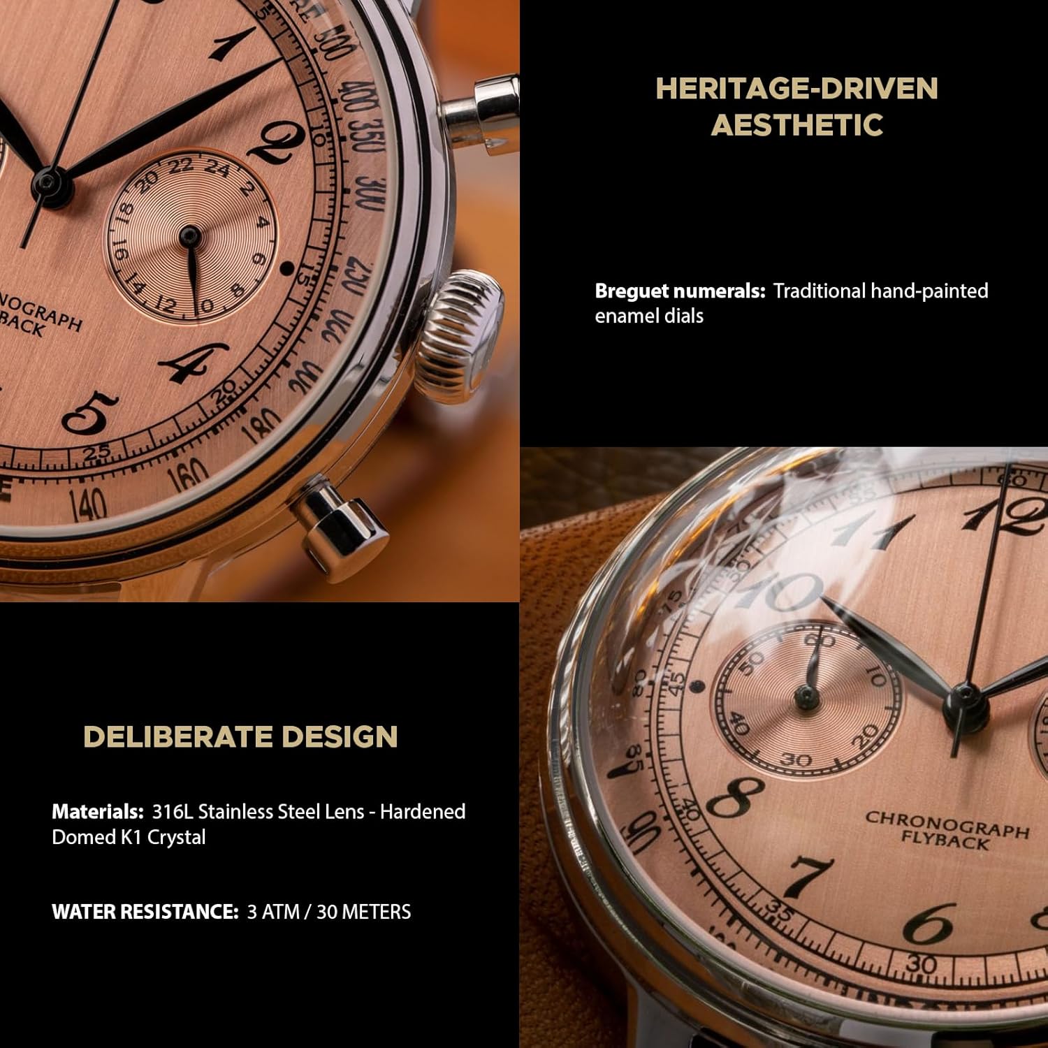 - Hardened Domed K1 Crystal Lens: The watch face is protected by a hardened domed K1 crystal lens, offering superior clarity and resilience compared to standard mineral glass. Its curved surface not only enhances readability but also gives the dial a refined, vintage appearance. The material is highly resistant to scratches and shattering, ensuring that your watch maintains its visual appeal through daily wear and tear. This upgrade over traditional crystals means better protection without compromising on style.
