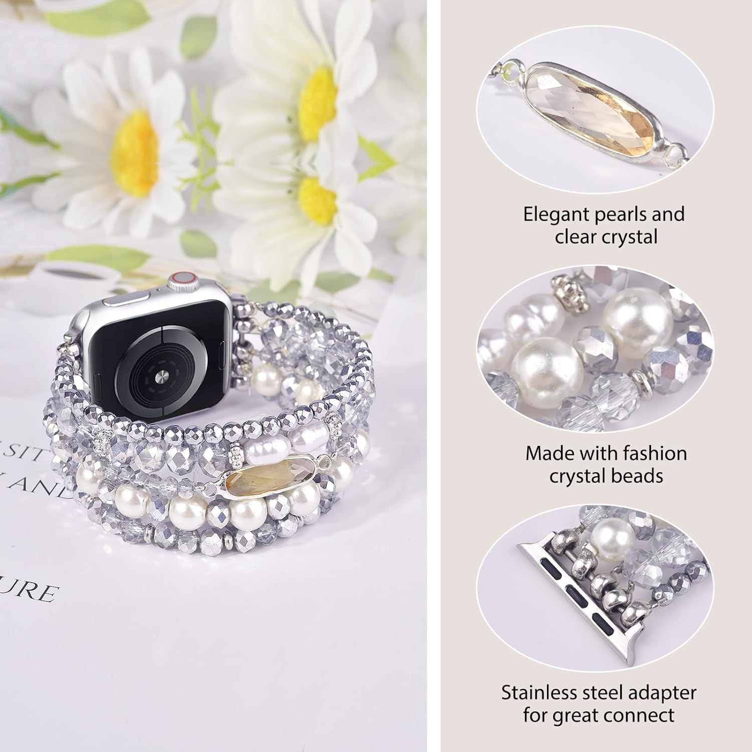 ✨Unique Style – Cute Watch Bracelet for Apple Watch 42mm/44mm/45mm made of high quality smooth beaded pearls and sparkling crystals, the iphone watch band is slowly polished by experienced artisans. Elegant look is perfect for women.