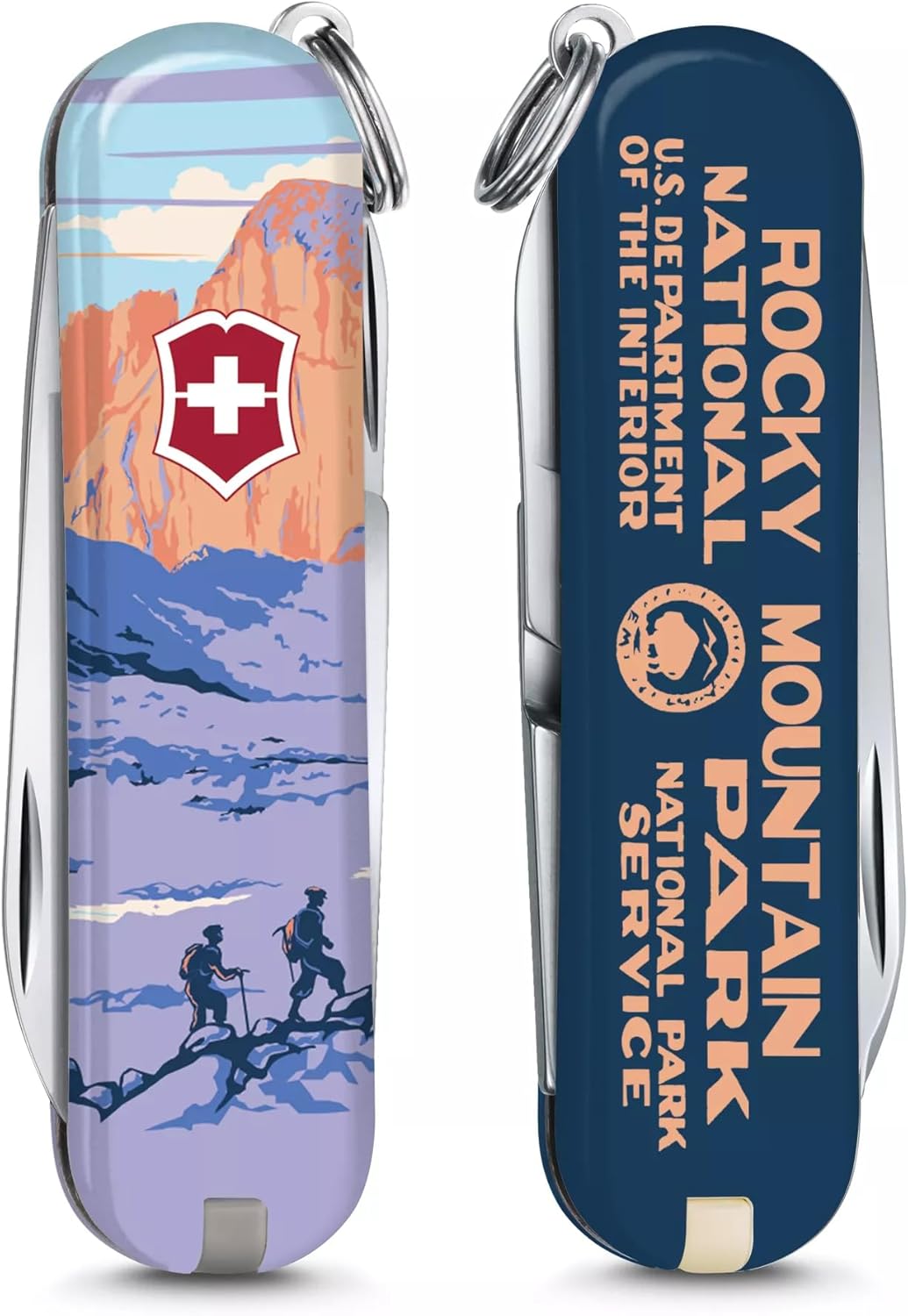 “meta_description”: “Compact 7-function Swiss Army Knife with Rocky Mountains National Park artwork. Features blade, scissors, screwdriver, tweezers, and key ring. Swiss made.”