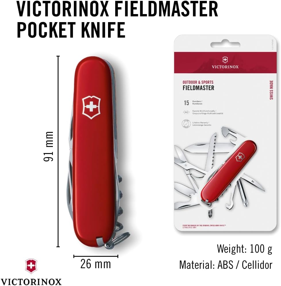The Fieldmaster is designed for everyday use and light-duty tasks. While built to Swiss Army Knife durability standards, it should not be used for heavy industrial applications or as a prying tool. Regular cleaning and occasional lubrication of moving parts will help maintain optimal performance. The knife comes packaged ready to use, with no additional assembly required. Always handle blades and sharp components with care to prevent injury. Keep out of reach of children unless under direct supervision. The red ABS/Cellidor scales are resistant to fading and impact but may show wear over time with heavy use.