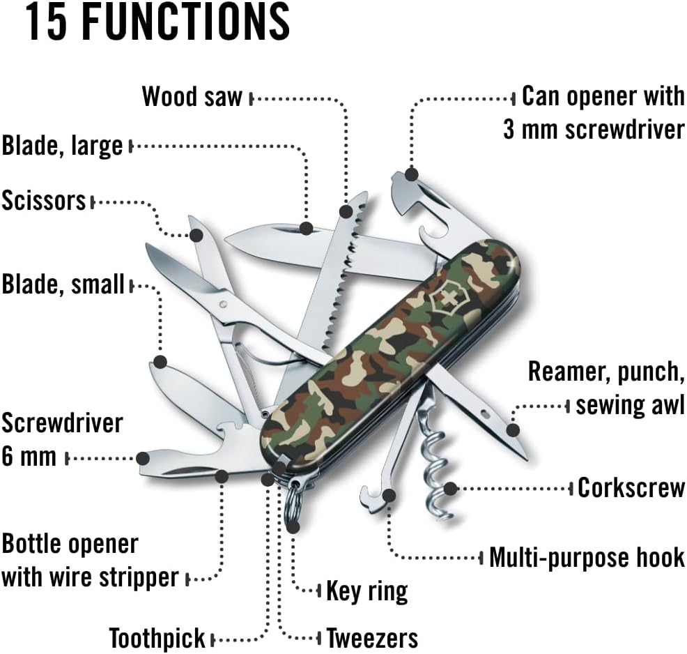 The Victorinox Huntsman excels in both outdoor and urban environments. For campers and hikers, the wood saw enables efficient processing of firewood or trail clearing, while the scissors are ideal for cutting cordage, tape, or fishing line. The can and bottle openers make meal prep and refreshments hassle-free at the campsite. Around town, the screwdrivers handle quick fixes, the blades open packages, and the reamer aids in small repairs. The multipurpose hook can secure a water bottle or gear to your pack, and the included tweezers and toothpick offer personal care on the go. Its compact size ensures it’s always within reach, whether in a backpack, glove compartment, or pocket. While not included, the knife is compatible with the Victorinox Fire Ant fire starter set (model 4.1330.B1), sold separately, for extended wilderness readiness.