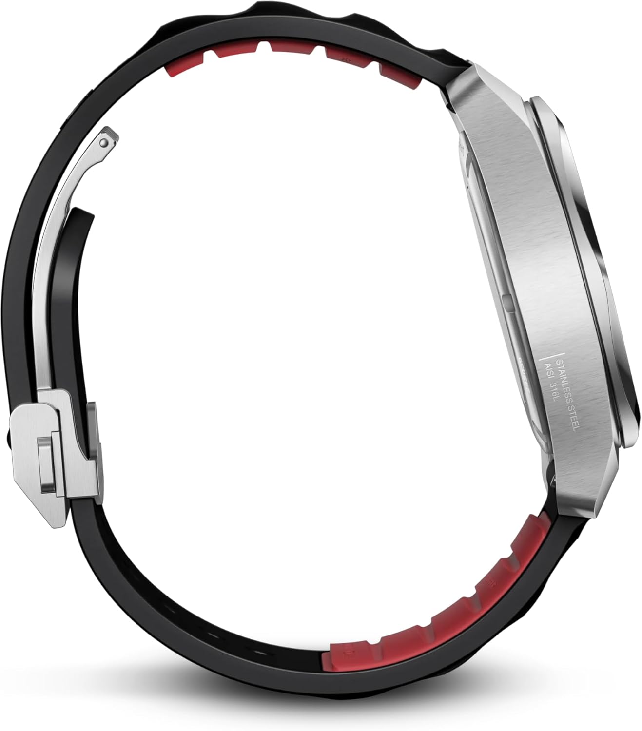 The integrated black rubber strap offers exceptional comfort, flexibility, and resistance to wear and tear. Lightweight and hypoallergenic, it’s designed for all-day wear, whether in the office, on a trail, or in the water. The strap’s textured surface provides a secure grip, while its sleek aesthetic complements the watch’s bold, masculine design. This durable material maintains its integrity in extreme temperatures and conditions, ensuring reliable performance over time.