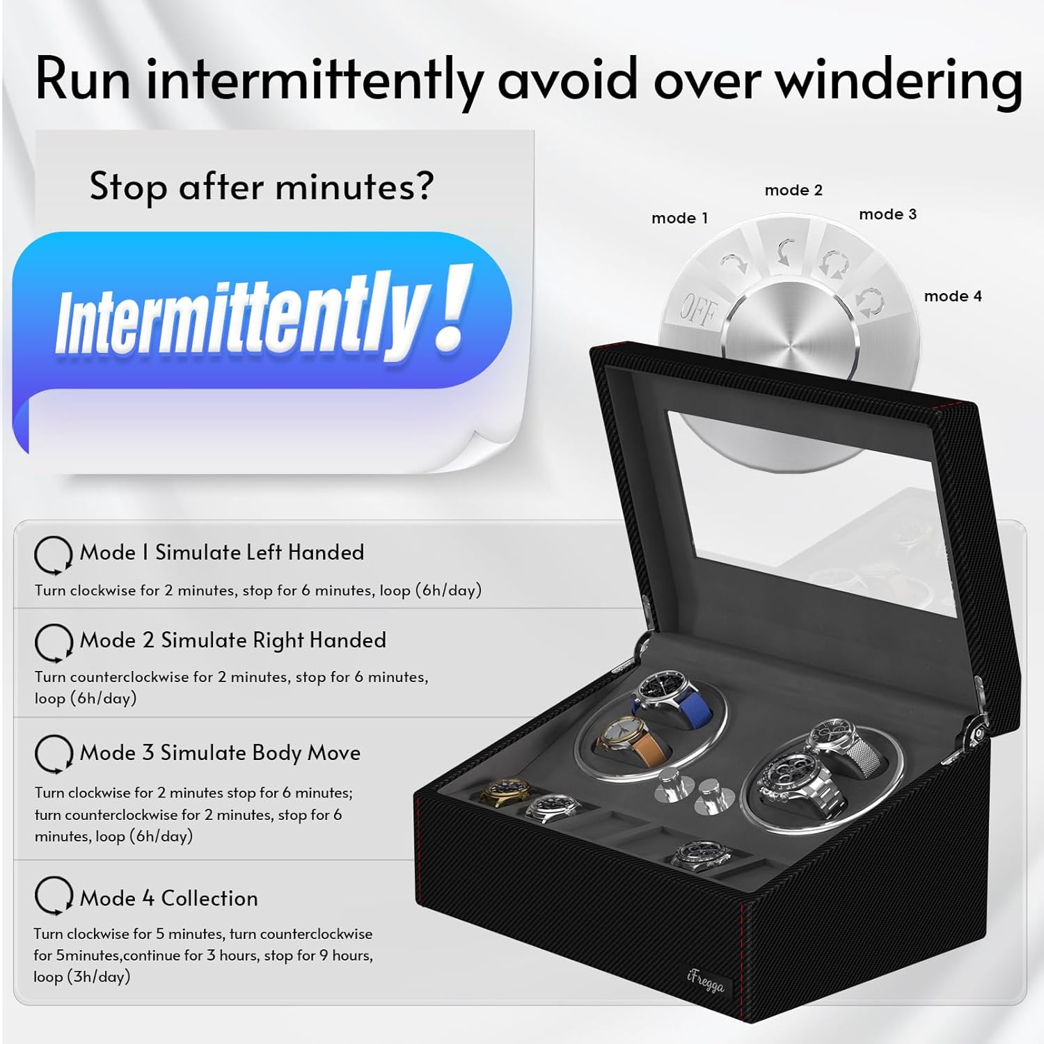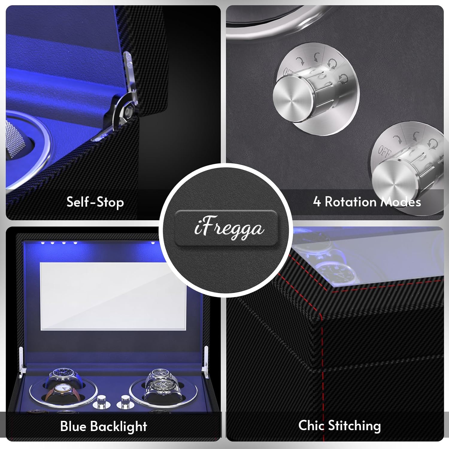 iFregga Watch Winders for Automatic Watches, 4 Mabuchi Winder+ 6 Extra Storage with Serenity Blue Backlight, Leather Shell Soft Velvet Lining Box, Open Lid Stop and 4 Modes(AC Power)