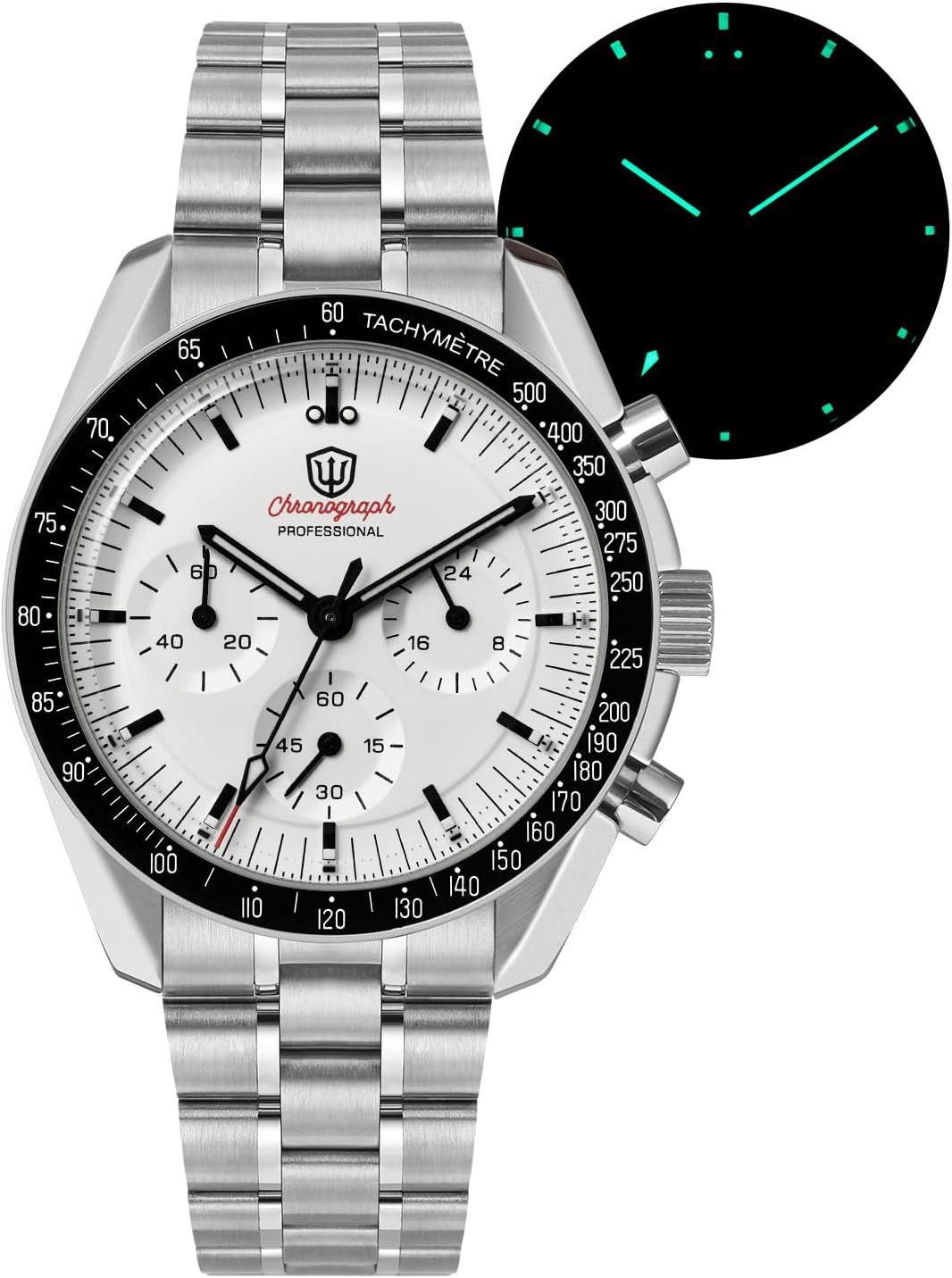 • 316L Stainless Steel Case and Bracelet – Crafted from high-grade 316L stainless steel, the case and bracelet offer superior corrosion resistance and a polished, professional finish. The bracelet features a 20mm to 16mm taper, ensuring a comfortable fit on the wrist, while the screw pin construction enhances durability. The included 5-hole micro-adjustment milled safety clasp allows for precise sizing and secure closure, combining convenience with reliability during active use.