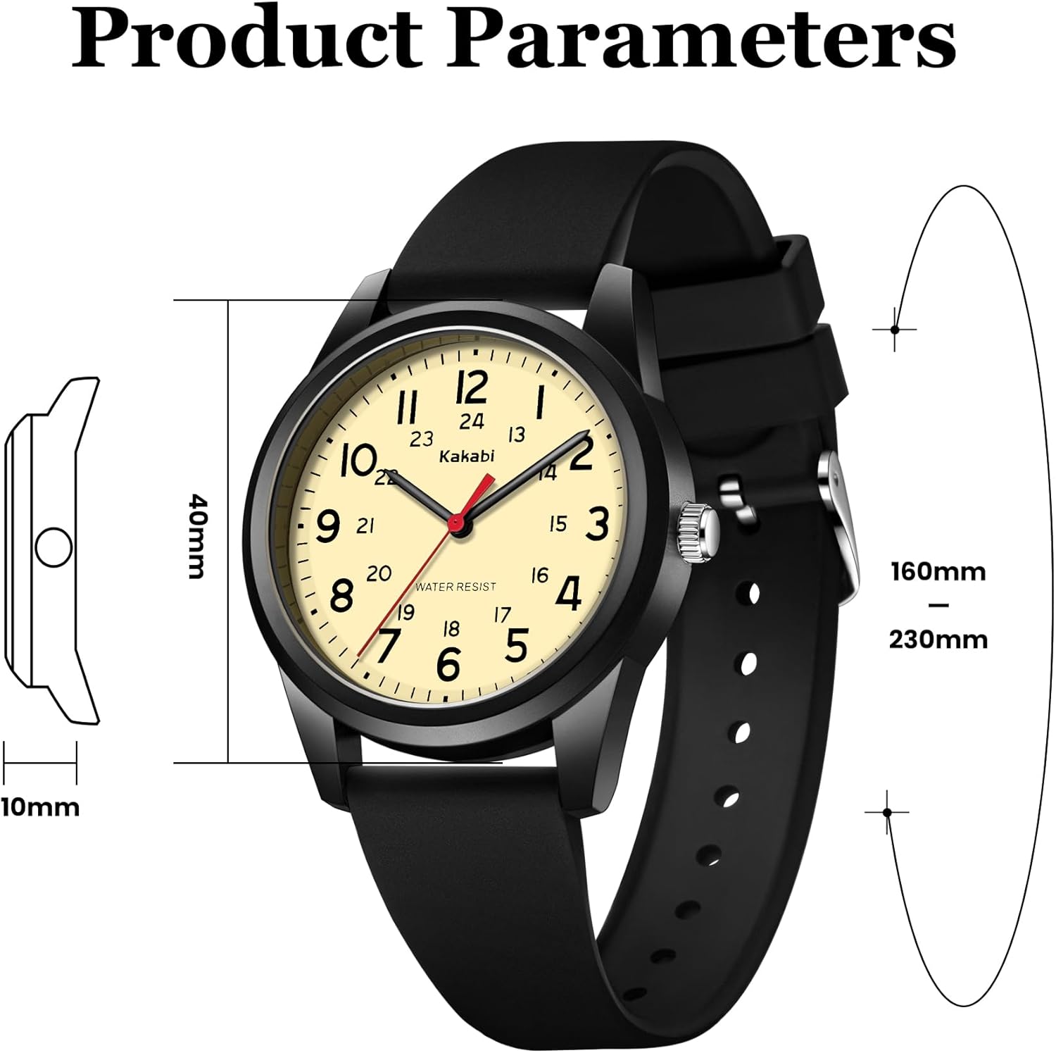 While this watch offers 30 meters of water resistance, it is not suitable for diving, snorkeling, or prolonged submersion in water. Avoid pressing buttons underwater to maintain the integrity of the seals. The included SR626SW (size 377) battery is standard and can be replaced at most watch repair shops or electronics retailers. For warranty details, customers are directed to click the provided link in the product documentation. Please note that the product was first made available on July 31, 2025, and is manufactured by Kakabi. Always ensure proper fit by checking the strap length against your wrist size before purchase, as silicone straps offer limited adjustability compared to metal or leather alternatives.
