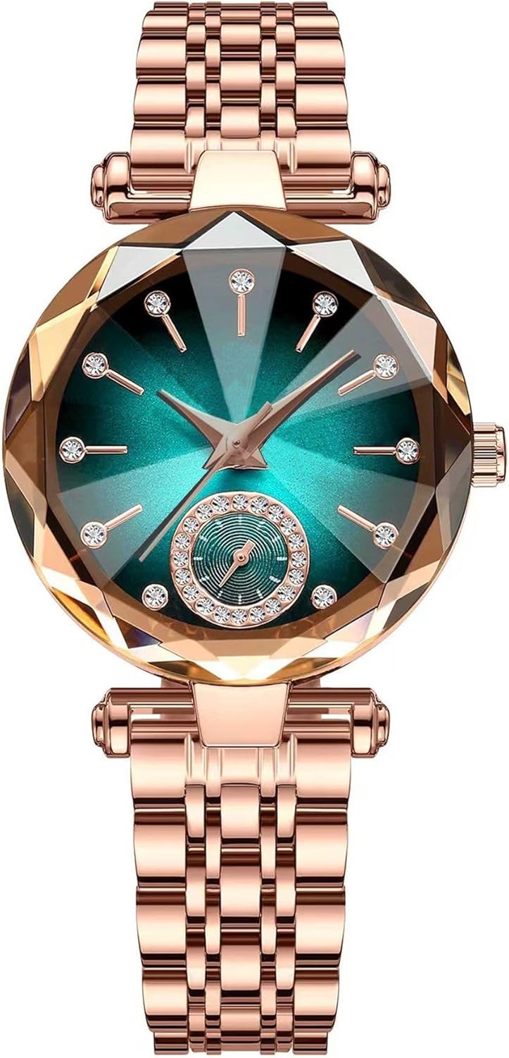 This elegant women’s watch blends timeless sophistication with contemporary fashion, designed specifically for the modern woman who values both style and practicality. At its core is a rose gold stainless steel bracelet that offers a refined finish, resisting daily wear while maintaining its luster. The watch face features a creative diamond-accented dial that catches light with subtle brilliance, adding a touch of glamour without overwhelming the design. Its analog display ensures classic, easy-to-read timekeeping, while the slim case profile allows it to slide comfortably under shirt cuffs or rest gently alongside other jewelry. With a lightweight build and versatile aesthetic, this timepiece transitions effortlessly from professional settings to evening events, making it a reliable accessory for daily wear or special occasions. Whether paired with a tailored blouse, a little black dress, or weekend casuals, it enhances any outfit with understated elegance.