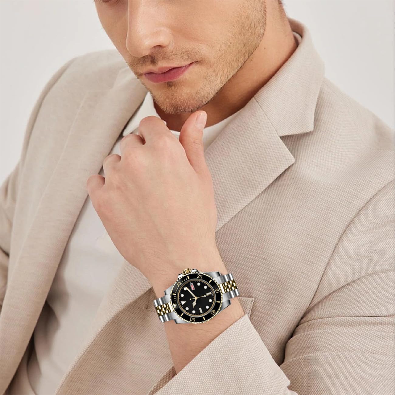 Very nice quality aftermarket watch band made from premium materials and construction. Fitment is excellent. And flatters my watch with its two tone colors. Safety fold over clasp perfect for your sport watch. Exceeded my expectations and highly recommended.