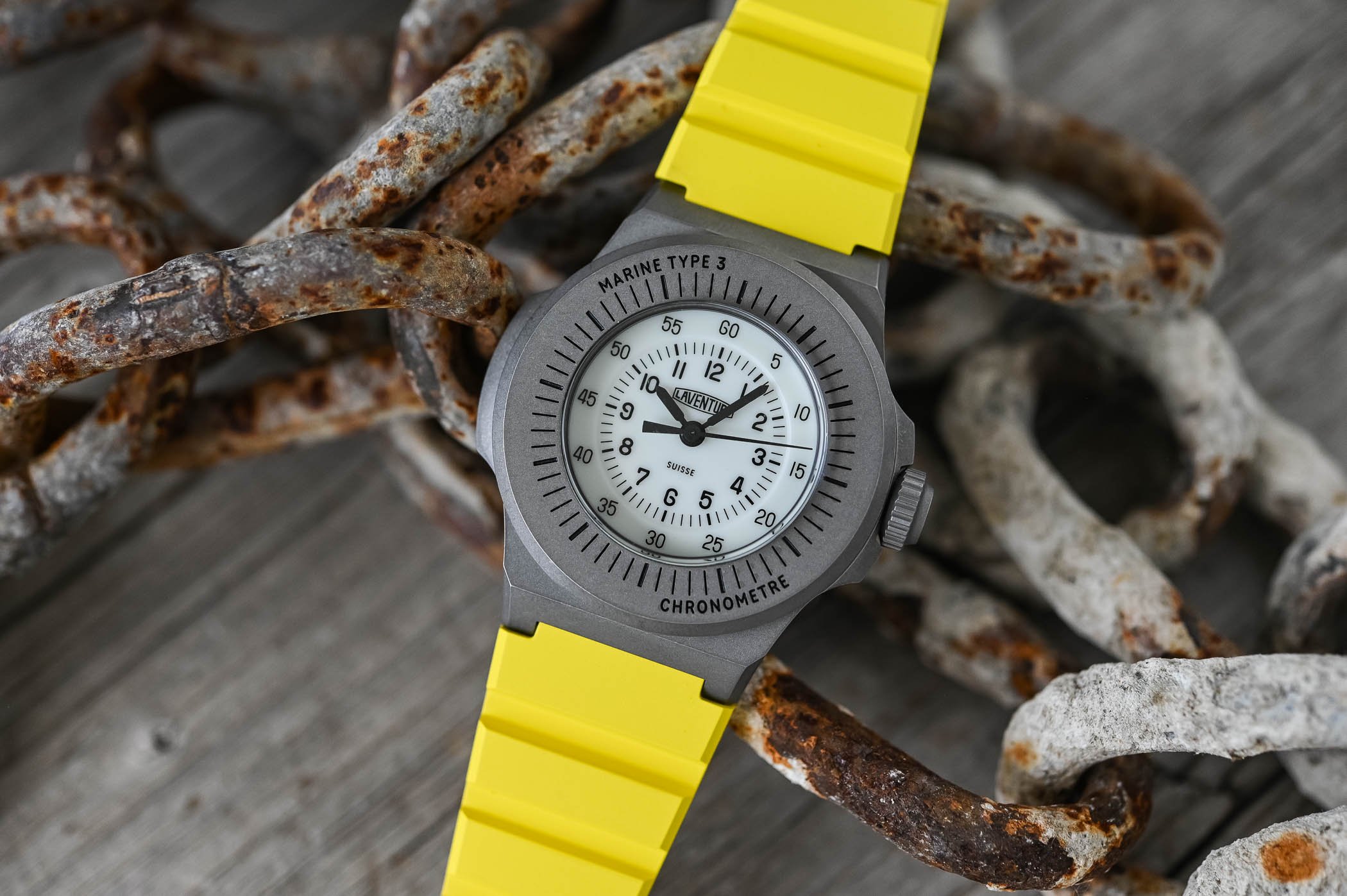 We discover probably the most important traits of the Marine Kind 3 engraved on the again of the lugs. That’s additionally the place you’ll study that the case is product of Grade 23 titanium. Blancpain additionally makes use of this titanium alloy for its Air Command, for instance. It’s purer than Grade 5, with decrease oxygen, nitrogen, and iron content material. That’s why it has superior corrosion resistance, fatigue energy, and hardness. The Laventure Marine Kind 3 encompasses a stone-washed end, leading to a rugged darkish grey look.